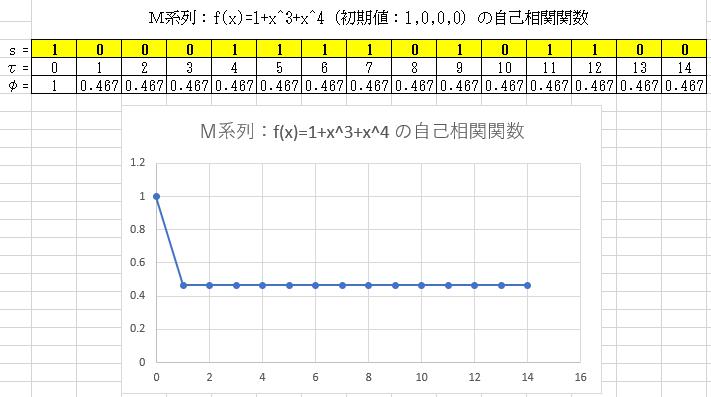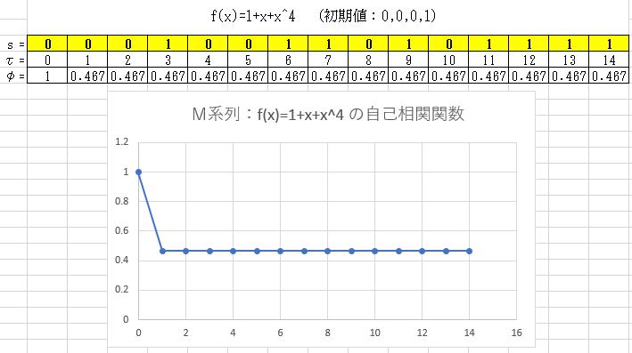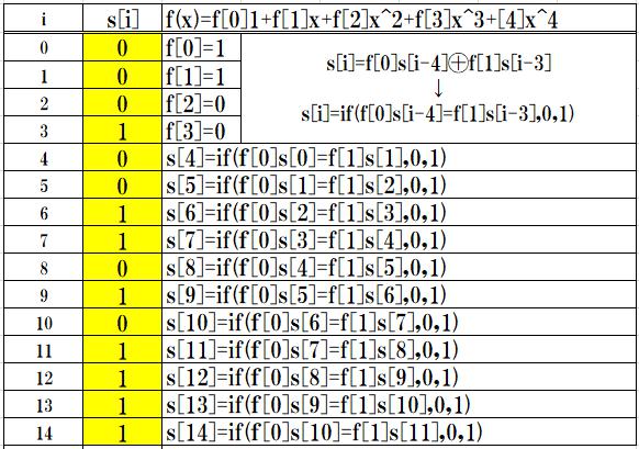 特性多項式f(x)=1+x^3+x^4、初期値1、0、0、0の1周期(=15)分のM系列は、