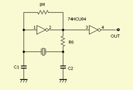 クロック発生回路は、ICのインバータ(論理否定)と水晶発振子、抵抗とコンデンサで作成します。