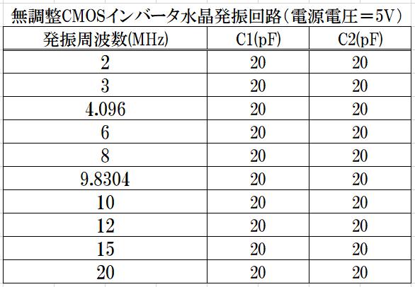 20MHz以下のクロックを作成する際の抵抗、コンデンサの値は以下の通りです。