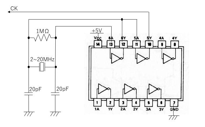 クロック発生回路は、ICのインバータ(論理否定)と水晶発振子、抵抗とコンデンサで作成します。